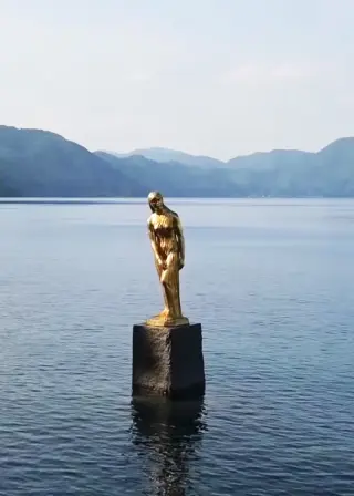 「田沢湖」の西側、「潟尻エリア」に立っている高さ2.3mの黄金の「たつこ像」。