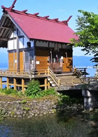 田沢湖の北岸近くに鎮座する朱塗りの鳥居が美しい神社。